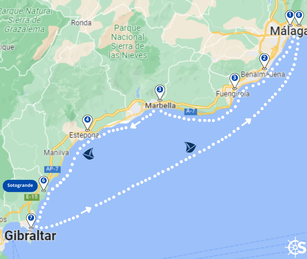 Von Málaga nach Gibraltar sind es etwa 60 Seemeilen. Die vorherrschenden Winde sind Ost- und Westwinde, so dass diese Überfahrt zu jeder Jahreszeit möglich ist. Wenn Sie gerne segeln, empfehlen wir Ihnen, ein Segelboot zu mieten. Wenn jedoch Kinder an Bord sind, ist es besser, einen Katamaran zu mieten, der mehr Komfort und Stabilität während der Fahrt bietet.