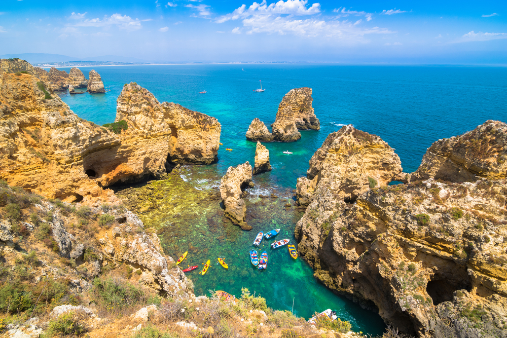 Starten Sie die Route in der Küstenstadt Lagos im Westen der Algarve. Die Algarve in Portugal ist berühmt für ihre Meereshöhlen, die sich in den Felsen gebildet haben. Das Mieten eines Bootes an der Algarve ist die einzige Möglichkeit, diese natürlichen Felsformationen zu erreichen. Wenn Sie die Höhlen betreten möchten, empfehlen wir Ihnen, ein eher kleines Boot zu mieten