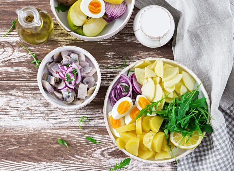 Nordische Fischsorten serviert zu Kartoffeln und frischen Salaten aus Kraut und/oder Roter Beete auf Remouladenbasis.