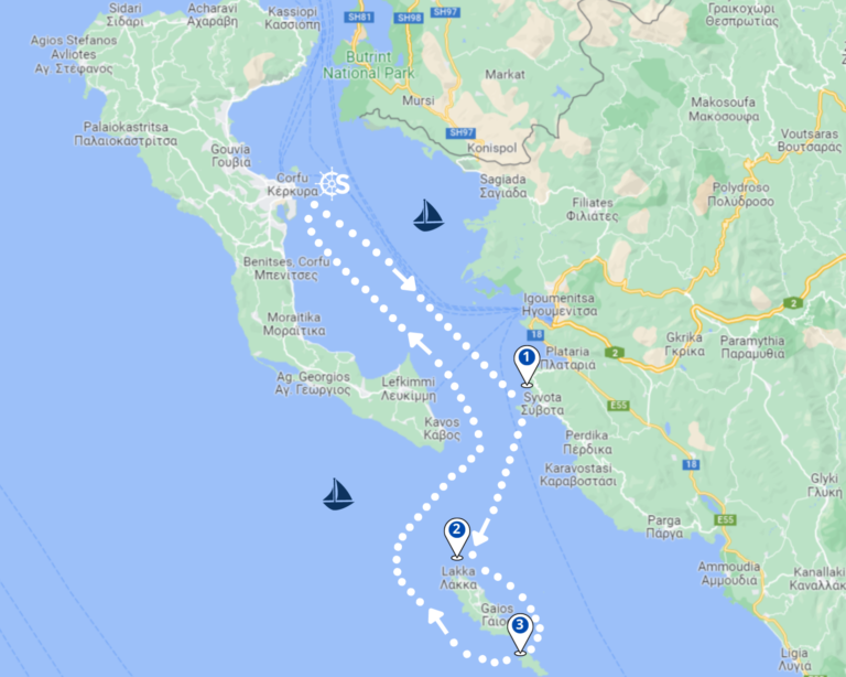 Südlich von Syvota kommt die Insel Paxos in Sicht. Die Legende besagt, dass diese Insel entstand, als der griechische Gott Poseidon seinen Dreizack gegen Korfu schlug, was zu der Schönheit führte, die bis heute besteht. An der Nordspitze der Insel befindet sich das traditionelle Dorf Lakka. Mit seinem tiefen Hafen, der auf natürliche Weise vor starken Winden geschützt ist, bietet es einen großartigen Anlegeplatz für Yachten. Die malerischen Gassen von Lakka sind es wert, erkundet zu werden, und bieten beispielsweise sich für ein Mittagessen an.