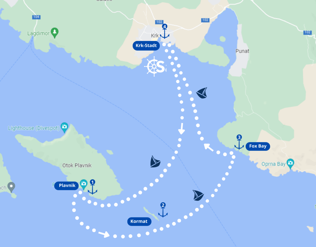 Der Startpunkt der Tagesboot-Route ist der Hafen in Krk-Stadt. Mieten Sie sich hier ein Boot und stechen Sie am besten morgens in See, um möglichst viel vom Tag zu haben und Touristenandrängen zu entgehen.
