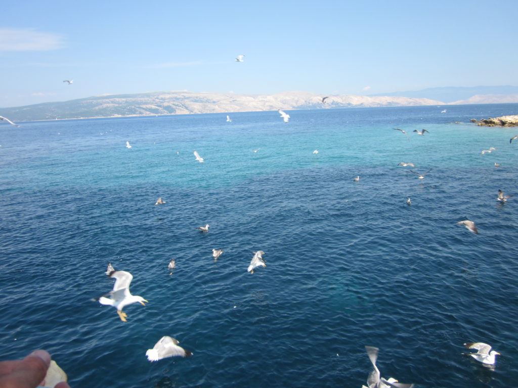 Fahren Sie nun wieder auf offene Gewässer heraus und halten Sie erneut die Augen offen. Denn hier, auf der offenen Seefläche zwischen Krk und Cres (der Insel hinter Plavnik) sind Delfinsichtungen nicht selten! Wir selbst haben nach kürzester Zeit bereits die ersten Delfine aus dem Wasser springen gesehen.