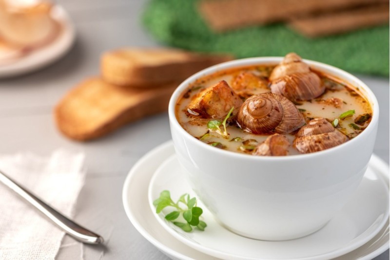 Danach werden sie in einer Hühnersuppe mit verschiedenen Kräutern und Gemüse gegart. Hauptbestandteile dieser sind Kartoffeln, Knoblauch, Fenchel, Petersilie, Pfefferminze und Chili. Dadurch erhalten die Schnecken Ihr deliziöses Aroma und werden samt Suppe und Weißbrot serviert.