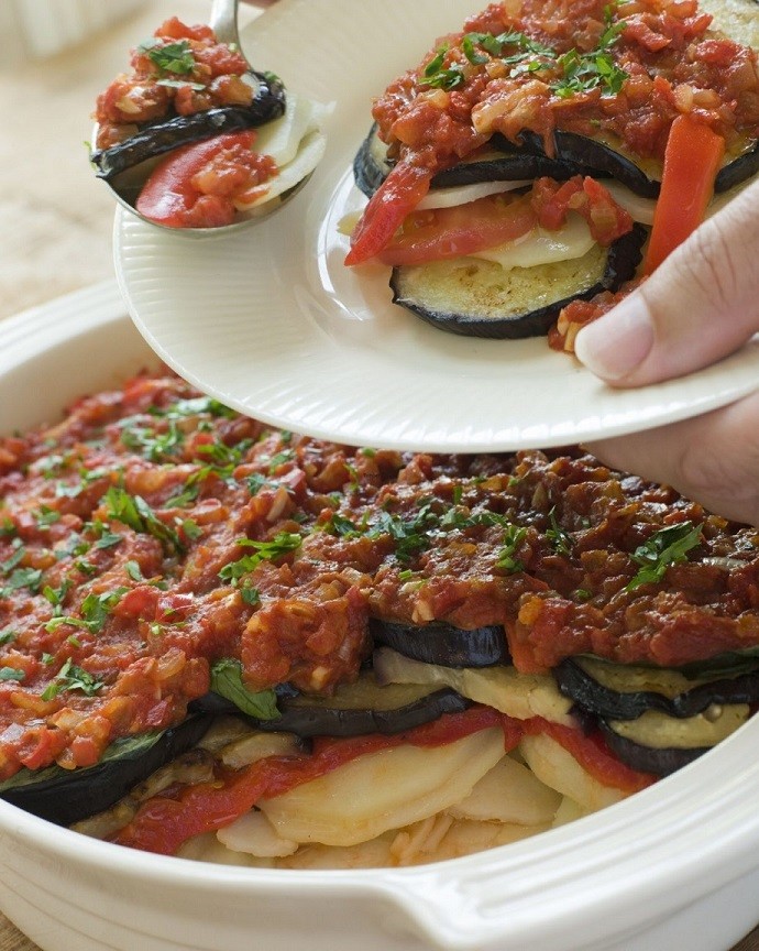 Dafür werden großzügig Kartoffeln, Auberginen, Zwiebeln und Paprika in kleine Scheiben geschnitten und in eine Auflaufform gestapelt. Anschließend wird diese traditionelle Speise mit Knoblauch, Olivenöl und Tomatensoße vollendet und im Ofen gegart.