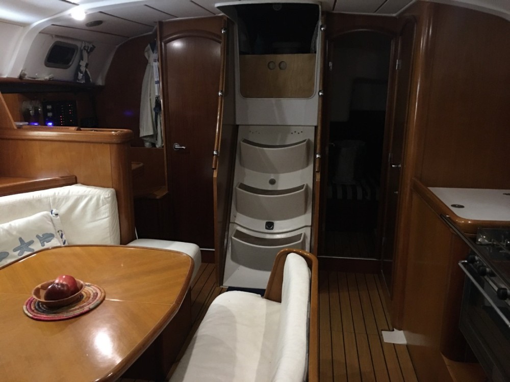 On peut accueillir jusqu'à 6 personnes en journée mais de préférence seulement 4 pour dormir en croisière car une des cabines sera réservée au capitaine. Ce voilier dispose de 3 cabines doubles et de 2 salles d’eau. Pour les croisières courtes de 2 à 4 jours le capitaine prendra place dans le carré vous laissant possible l'utilisation des 3 cabines. Conçu pour naviguer sans effort ce voilier combine toutes les qualités requises pour la croisière. Offrant aux plaisanciers des conditions de vie en mer plus que confortables. Étonnamment spacieux, l'intérieur de ce Bénéteau de près de 13 m séduit par la richesse des matières, l'élégance des volumes et le luxe raffiné des aménagements. Tout à bord a été pensé pour que 6 personnes puissent vivre à l'aise, cependant nous conseillons d'être plutôt à 4 pour le bien être de chacun et pour des croisières confortables . Nous privilégions et proposons uniquement de préférence les demandes avec accompagnateur et/ou skipper. Les cabines indépendantes aux deux extrémités préservent l'intimité de chacun. La cuisine ventilée et fonctionnelle, est équipée pour le plaisir du "chef". La table à cartes et l'électronique est suffisante pour le navigateur. Deux cabinets de toilette dont un spacieux donneront à votre croisière une dimension de confort supplémentaire. A bientôt sur les flots Alain
